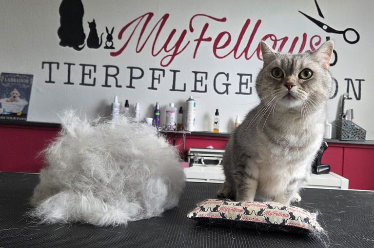 Oft entsteht sogar bei Kurzhaarkatzen ein echter Wow-Moment, wenn sichtbar wird, was eine professionelle Fellpflege bewirken kann.